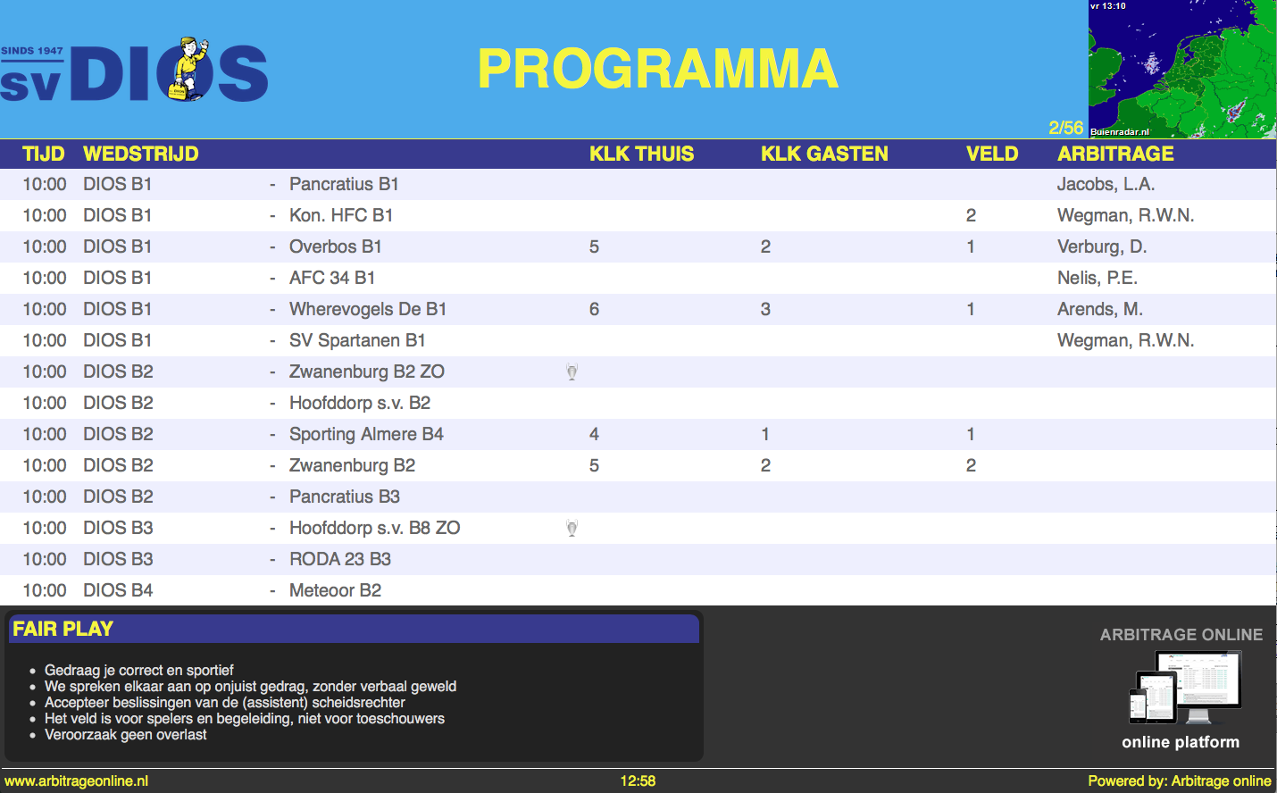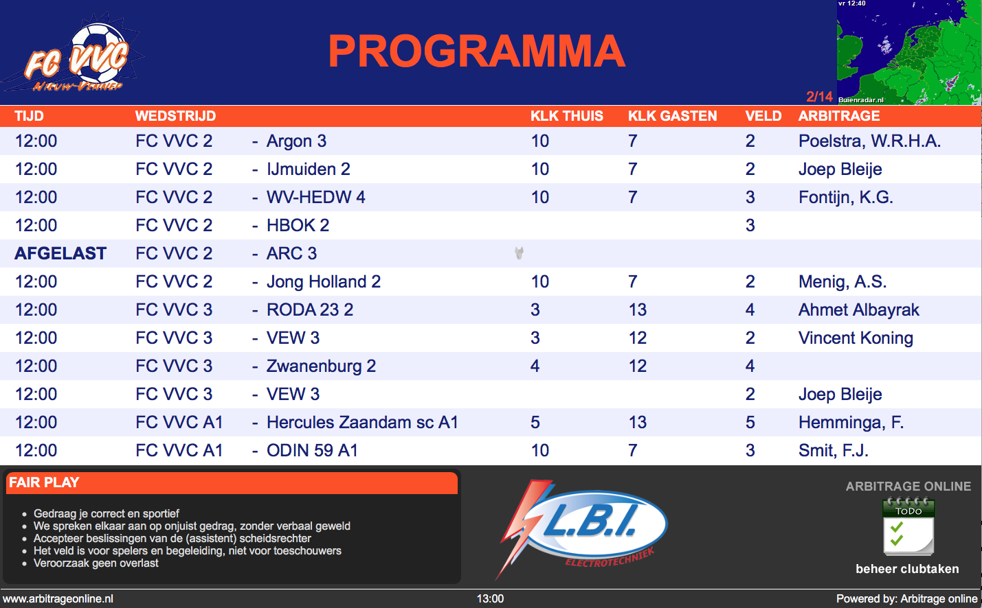 Toon het actuele speelprogramma, veld- en kleedkamerindeling, arbitrage en nog meer op een scherm in het clubhuis.